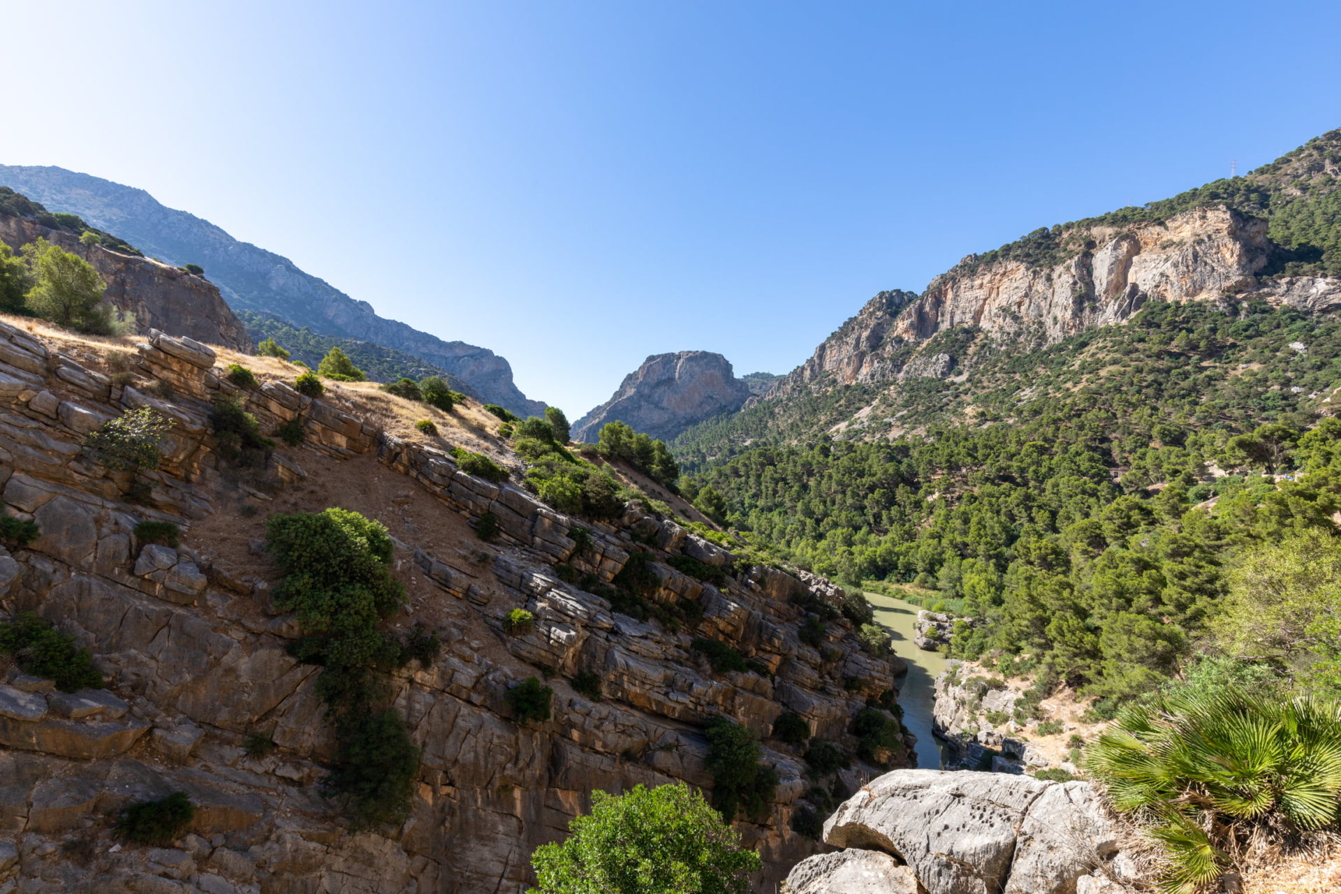 Avec cette photo, on se rend compte que l’on entre dans le vif du sujet. Si l’on se retourne – toujours avec ce réflexe lors des randonnées, l’angle de vue et le décor peuvent être plus intéressants qu’en marche avant 🙂 – on peut voir la passerelle courir sur le flanc de la paroi. Mais, pour l’instant, elle est encore à une altitude raisonnable. Les sensations vont bientot changer…